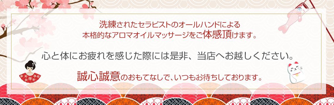 当店自慢のセラピストは、マッサージ技術、コミュニケーション力に長けており皆様にご満足頂ける事と思います。 常日頃、皆様を癒すことを最優先に考えております。厳選したセラピストによるオールハンドのアロママッサージで、『上質』にこだわり真心こめた穏やかな癒しを追求し、通常のエステ店とは比べものにならない程に、お客様の心と体をケアします。